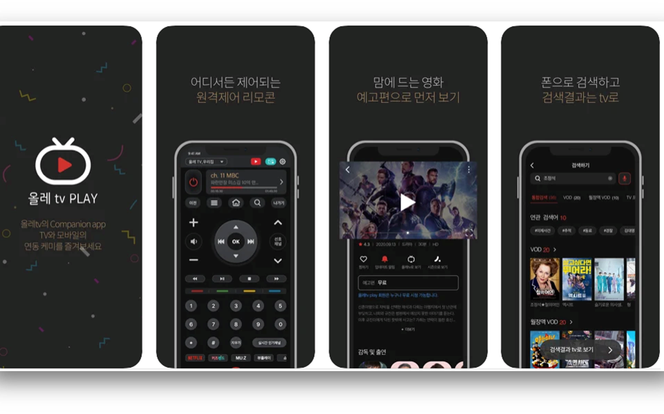 KT Olleh TV Play 어디서든 제어되는 스마트TV 원격제어 리모컨 맘에 드는 영화 예고편으로 먼저보기 폰으로 검색하고 검색결과는 TV로 복잡한 채널 편성표 앱으로 한 눈에, 한번씩- Date
